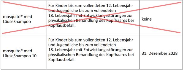 Die Streichung aus der Anlage V bezieht sich jedoch nur auf Produkte mit dem Namen mosquito® med LäuseShampoo. Das in der ABDA-Datenbank weiterhin gelistete mosquito® med LäuseShampoo 10 bleibt gemäß der Anlage V bis Ende 2028 erstattungsfähig.