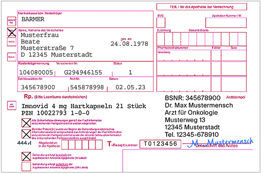 Ihnen liegt am 2. Mai eine Verordnung über Imnovid auf einem T-Rezept vor. Der Satzteil ist nicht durchgestrichen.