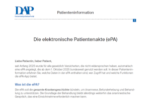 Anfang 2025 wurde für alle gesetzlich Versicherten, die nicht widersprochen haben, automatisch eine ePA angelegt, die seit dem 1. Oktober 2025 bundesweit genutzt werden soll. Die Patienteninformation informiert darüber, welche Daten zur Unterstützung der Anamnese, Befunderhebung und Behandlung eingestellt werden, welche zusätzlichen Übersichten bereits enthalten sind und künftig noch hinzukommen sollen, wer Zugriff auf die ePA erhält und welche Funktionen die ePA-App den Versicherten bietet.