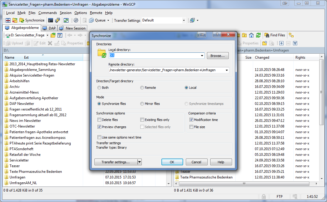 Bei Direction/Target directory "Remote" auswählen und OK klicken.