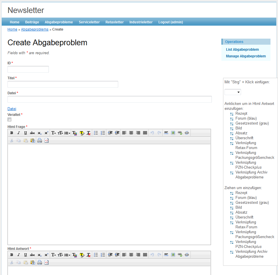 Den Menüpunkt Abgabeprobleme auswählen und auf Create Abgabeproblem klicken.