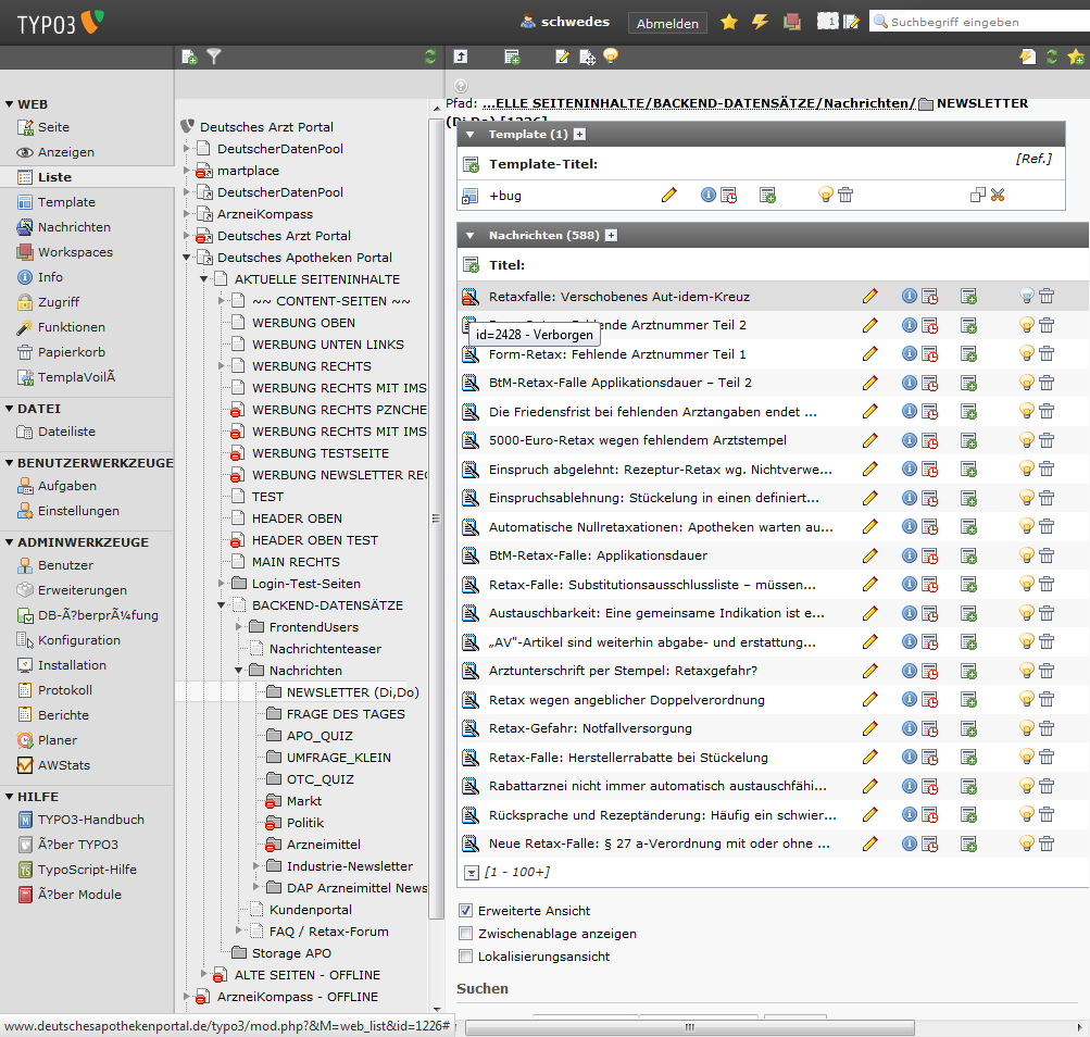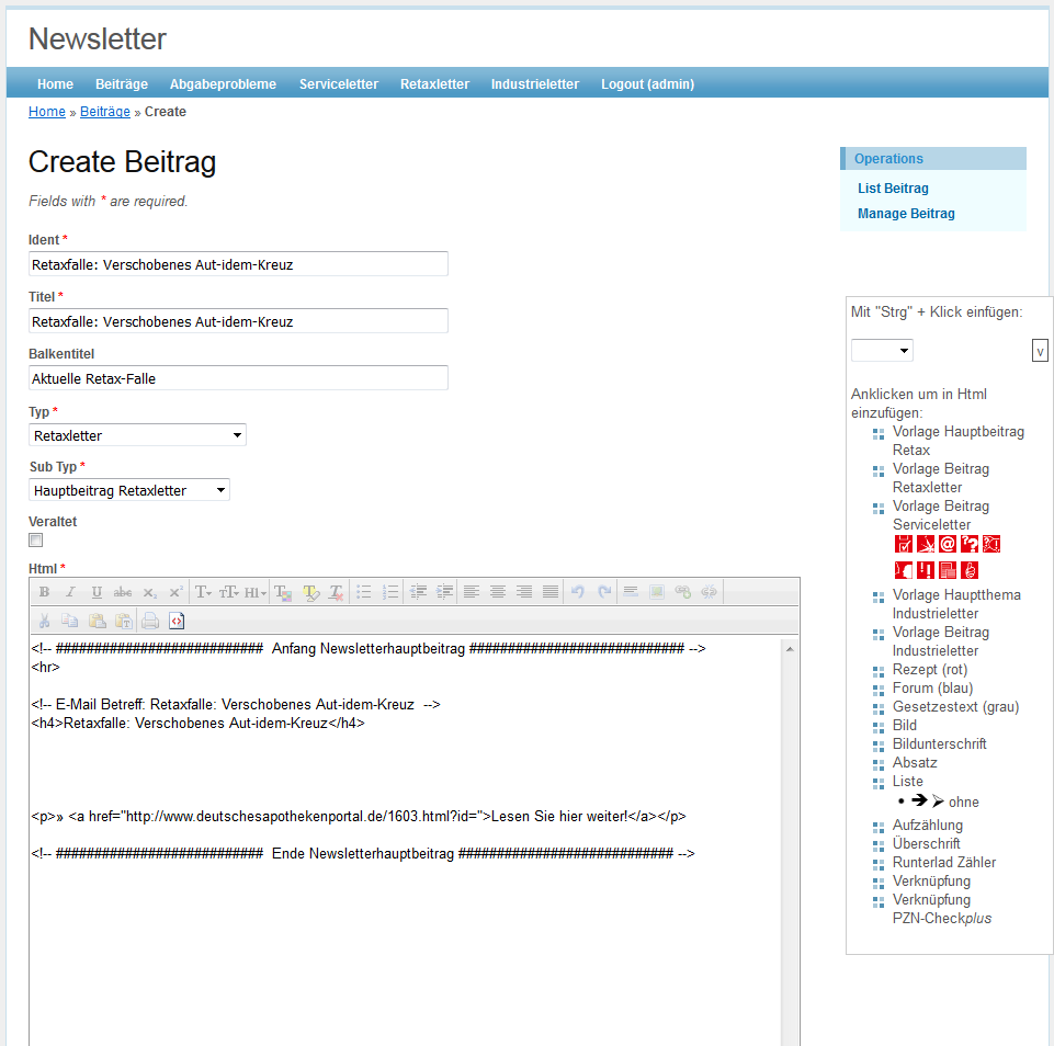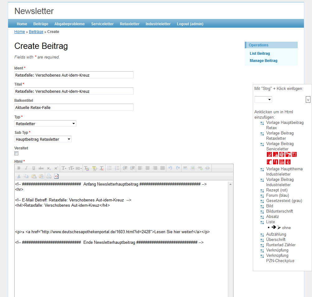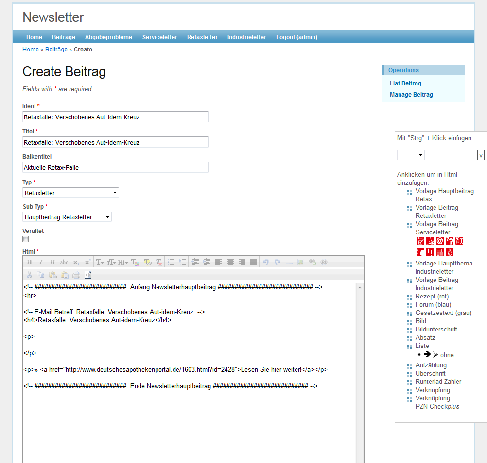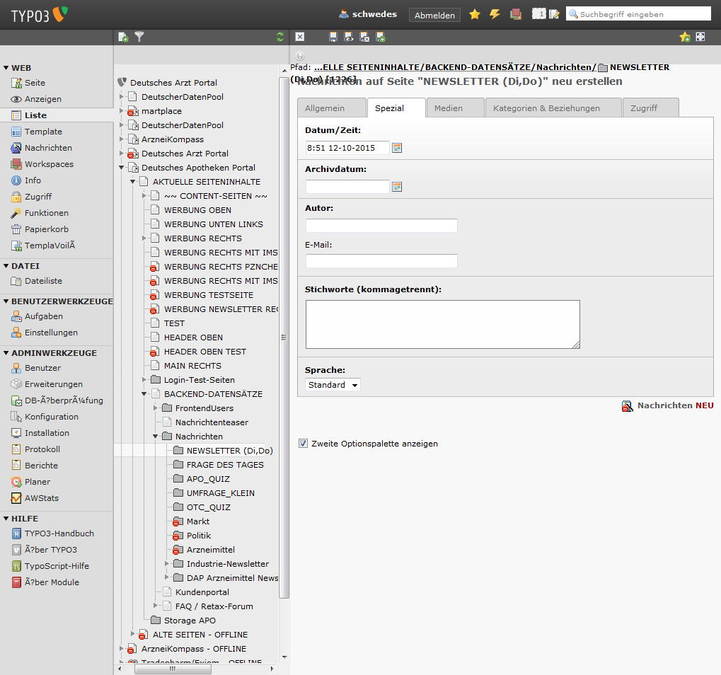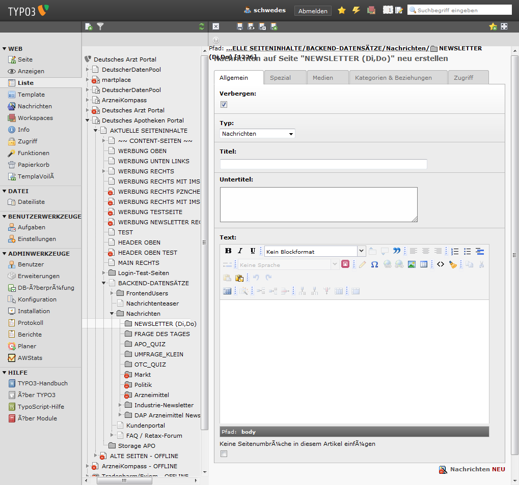 Im typo3 ins Verzeichnis "NEWSLETTER (Di, Do)" wechseln und einen neuen Datensatz anlegen.