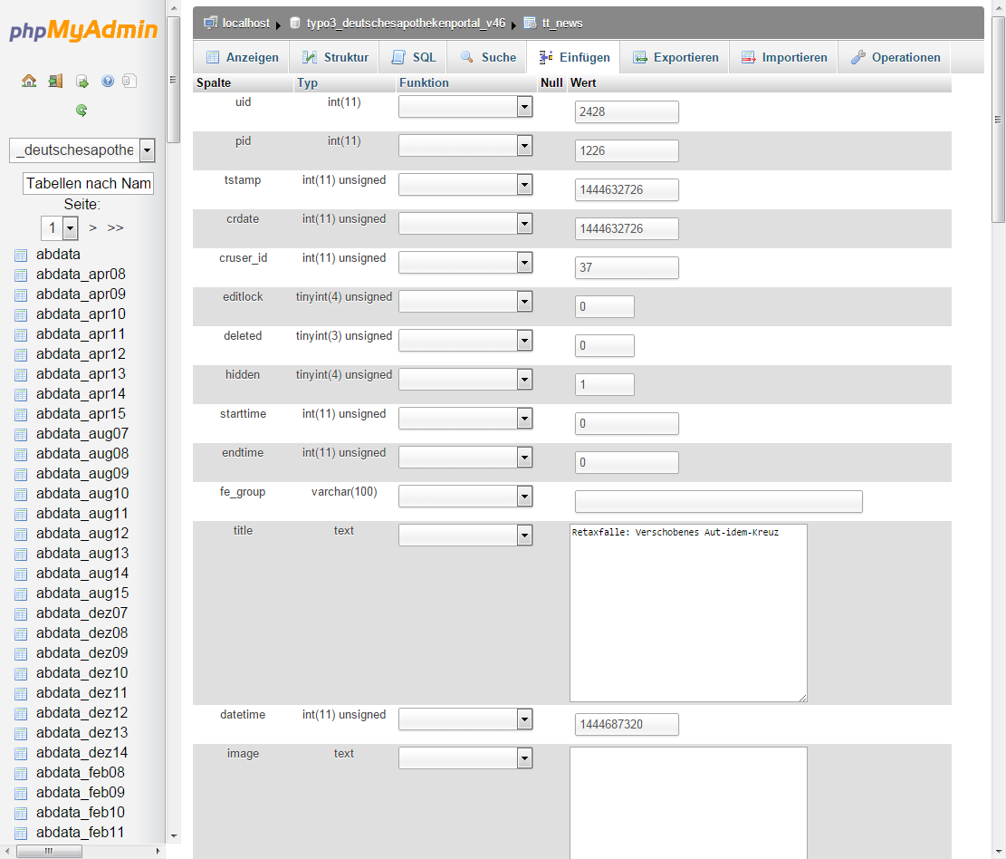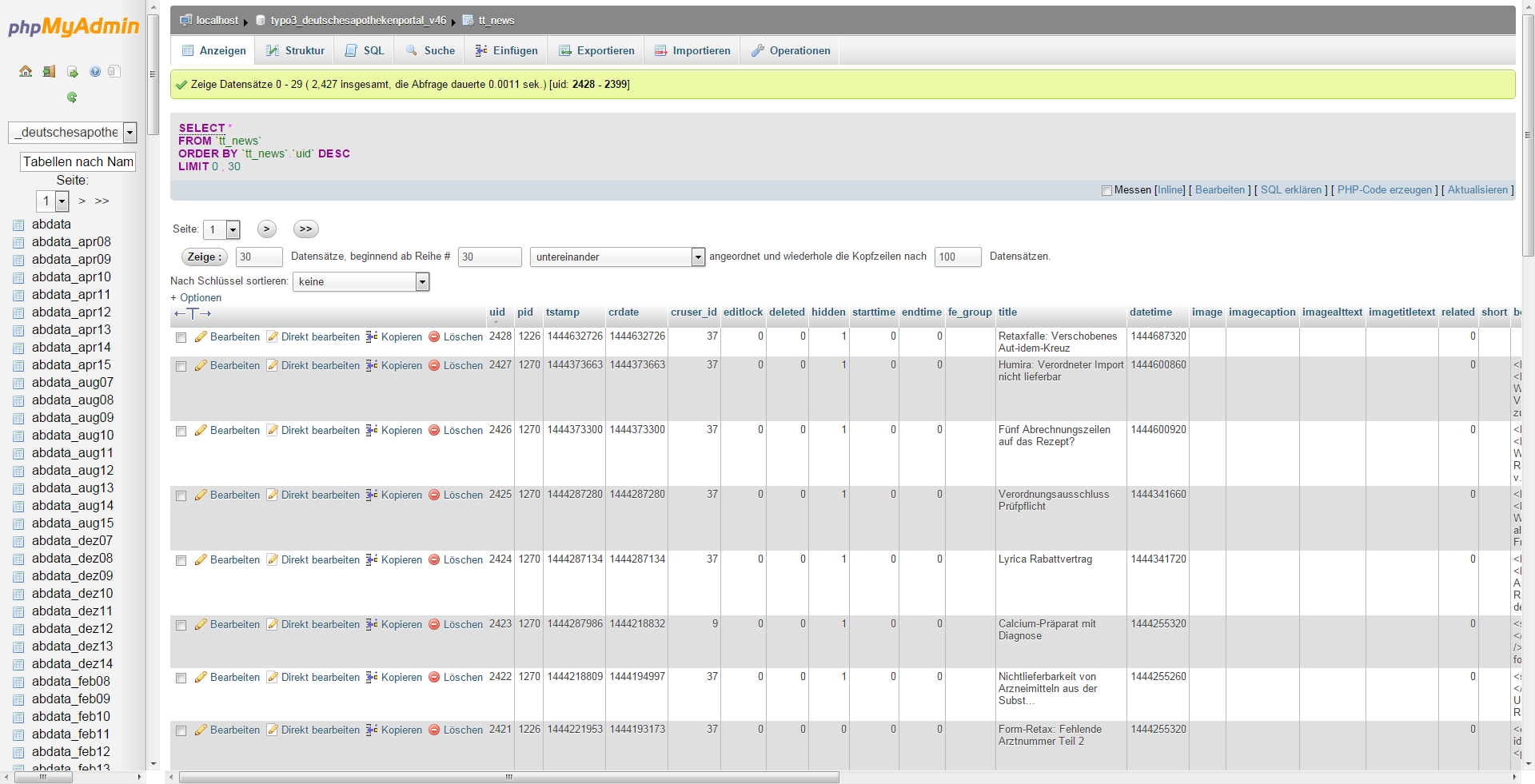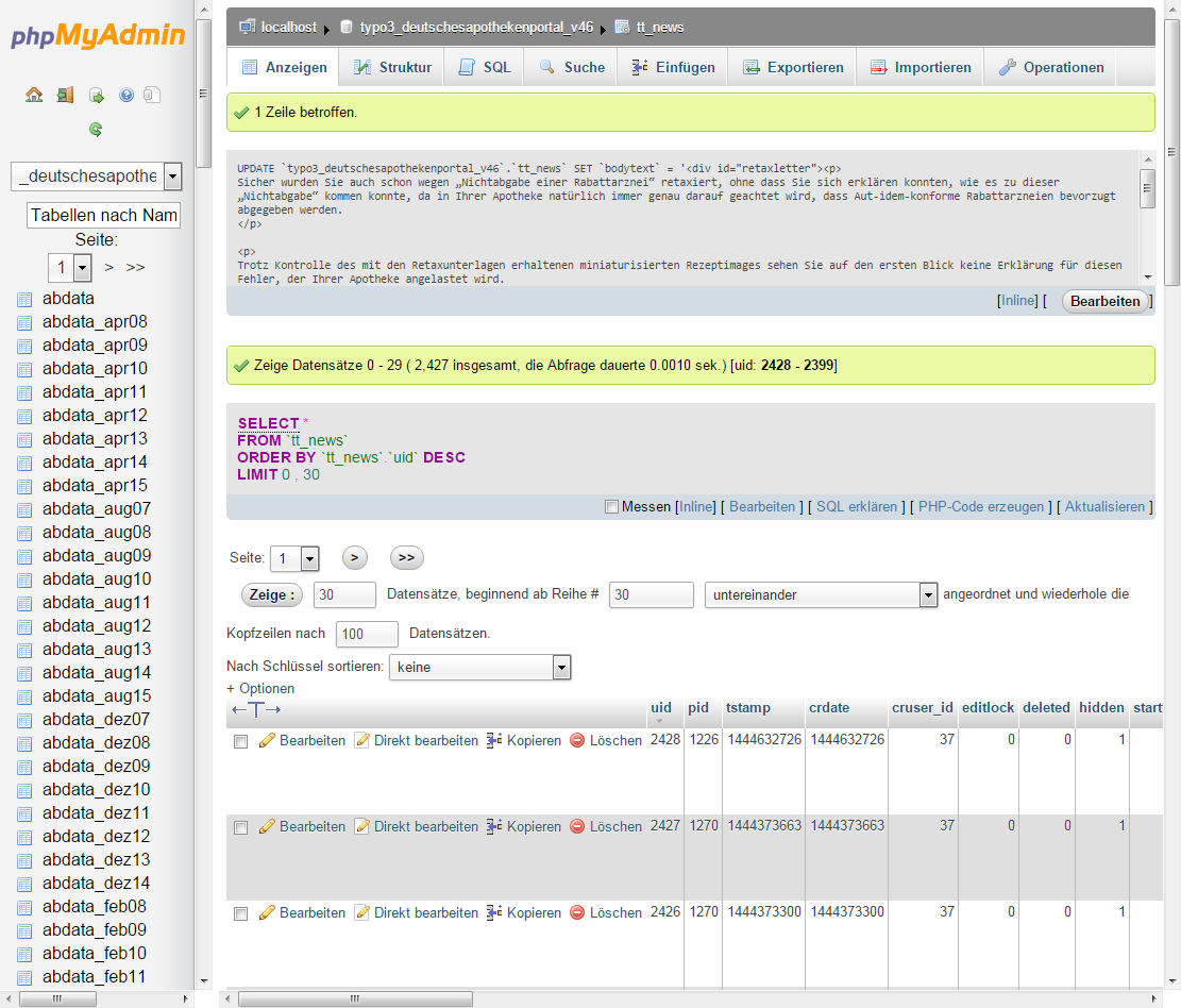 In der Datenbank über phpMyAdmin in die Tabelle tt_news wechseln und nach Spalte "uid" absteigend sortieren.