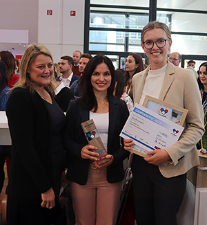 Abb.: Catrin Miragall (ADG) und Preis­trägerinnen Sabine Krause und Alicia Starke­meier aus der Barbara-Apotheke