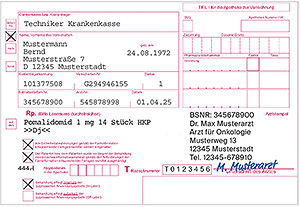 Im April wird Ihnen ein T-Rezept mit einer reinen Wirkstoffverordnung innerhalb der vorgeschriebenen Rezeptgültigkeit vorgelegt: Pomalidomid 1 mg 14 Stück HKP zulasten der Techniker Krankenkasse (IK 101377508).