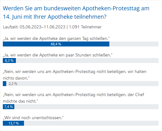 Das Ergebnis ist erfreulich: Unter den 1.091 Teilnehmern der Umfrage werden 68,4 % die Apotheke den ganzen Tag und 8,3 % für ein paar Stunden schließen. Das sind gut drei Viertel der Apotheken, die so auf den Personalmangel, die sich zuspitzende Lieferengpasskrise, den zehnjährigen Stillstand beim Apothekenhonorar und die teils unverhältnismäßigen Retaxationen aufmerksam machen wollen. Lediglich 9,6 % der Kollegen werden sich nicht beteiligen, wobei 7,4 % angaben, dies nichts zu tun, weil die Apothekenleitung dies nicht möchte. Schade, wie wir finden, denn nur wenn alle Apotheker zusammenstehen, kann den Missständen der Branche in der Öffentlichkeit und Politik Nachdruck verliehen werden. Die noch unentschlossenen Apotheken (13,7 %) geben sich vielleicht bis morgen noch einen Ruck und unterstützen mit der Apothekenschließung und vielleicht sogar mit der Teilnahme an einem Protestmarsch oder einer Kundgebung die Aktion.