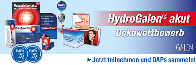 Der Sommer steht bald vor der Tür – und mit ihm kehren auch lästige Allergien und Haut­probleme wie z. B. Mallorca-Akne oder auch entzündete Insekten­stiche zurück. Außerdem können Sie HydroGalen akut Creme von GALENpharma mit 30 % Rabatt im Direkt­bezug bestellen. Nehmen Sie dazu einfach an der aktuellen DAP Umfrage „HydroGalen® akut Creme – erste Hilfe bei Juck­reiz und Co.“ teil, um das Bestell­formular zu erhalten – und verdienen Sie neben­bei noch 50 DAPs.