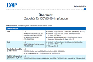 Aufgrund der Änderung der „Allgemeinverfügung zur Sicherstellung der flächendeckenden Verteilung von Impfstoffen gegen COVID-19“ bekommen Apotheken seit dem 08.04.2023 Impfstoffzubehör nicht mehr bei ihrer COVID-19-Impfstoffbestellung vom Großhändler mitgeliefert. Bei der Bestellung von Impfstoffzubehör muss beachtet werden, dass die einzelnen Impfstoffhersteller teils unterschiedliches Zubehör empfehlen. Die folgende neue Arbeitshilfe des DeutschenApothekenPortals gibt eine Übersicht über die einzelnen Impfstoffe und darüber, welches Zubehör gebraucht wird.